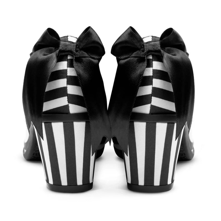 Skoene har en hvid flæse med sort silkebånd rundt langs forfoden. På spænderemmen sidder en lille aftagelig medaljon med en fugl i bur.